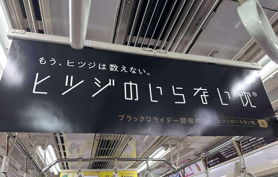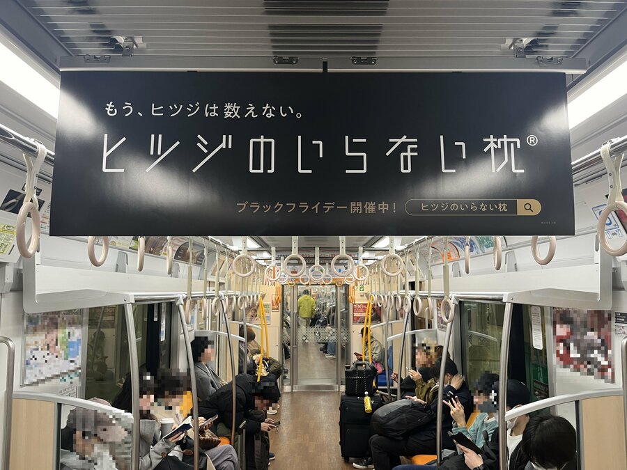 JR・私鉄を含む11社にて中吊り広告を掲出し、首都圏でのブランド接触機会を大幅に強化します。ビジュアルは、ブラックを基調に、ブランドロゴと「もう、ヒツジは数えない」という印象的なコピーを配置し、シンプルかつ強いメッセージの認知拡大を図ります。
