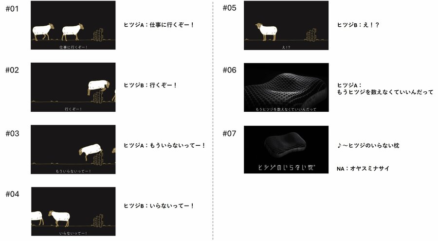 「ヒツジのいらない枕」という独自の名称は、ブランドが持つ大きな資産です。今回のCMでは、その“名前の意味”を丁寧に紐解き、視聴者の理解と好意形成につなげることを目的に制作。親しみやすい線画アニメーションならではの温度感ある表現で、「羊を数える間もなく眠れる」というブランドメッセージを印象的に届ける構成としています。