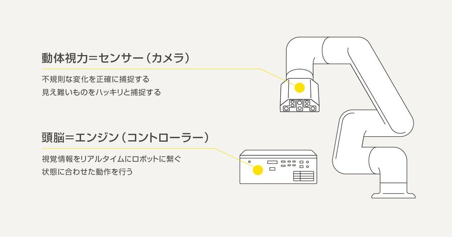 ロボットビジョンシステムはセンサー(カメラ)とエンジン(コントローラー)で構成され、ロボットアームに動体視力と頭脳の機能を付与することで、ロボットアームの高速・柔軟な動作を実現します。ニコンがカメラ製品の開発で培った高速画像処理により、瞬時にワークの状況を判断して動作することができ、生産現場において「ビジョントラッキング」や「ばら積みピッキング」といったアプリケーションを提供しています。