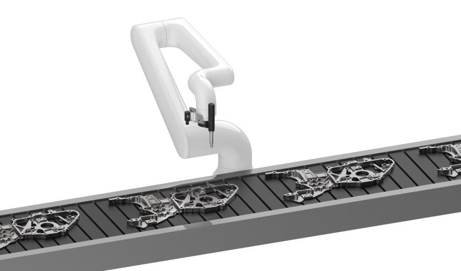 ニコンが長年のカメラ開発で培った技術を応用した高速画像処理能力を有しているため、ワークの状況を瞬時に判断し滑らかなビジョントラッキングを実現します。例えば、搬送機器上のワークへのボルト挿入・ボルト締結を、搬送機器を動かしたまま行う生産現場等で活用いただくことが可能です。搬送機器の速度やワークの位置・姿勢に突発的な変化が生じた場合でも、リアルタイムで補正を行い、安定した作業を継続できます。これにより、従来のシステムのように搬送機器を一時停止することなく、連続した作業が可能となり、生産効率の向上に貢献します。
