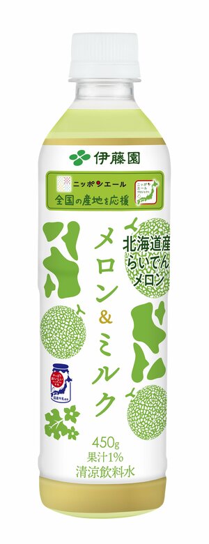 「ニッポンエール メロン&ミルク」は、糖度の高い北海道らいでんメロン果汁と国産牛乳を使った清涼飲料です(果汁1%)。青肉メロンの甘みと厚みのあるミルク感が特長で、そのおいしさを通じてメロンや牛乳の魅力を全国に発信し、メロン農家と酪農家の皆様を応援します。