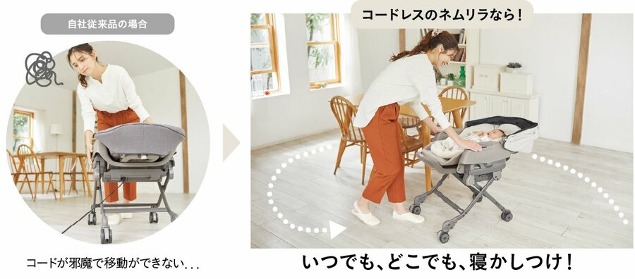「ネムリラ コードレス」は、新生児から生後1才頃まで自動で15分間、ママの心拍数に近い周期(1分間に約69回)でやさしく揺らし、平均5分42秒(※6)で赤ちゃんを眠りへ誘います。付属の充電式バッテリーを用いて自動スウィング機能が使えるので、ダイニング・リビング・脱衣所など、生活リズムにあわせて室内のどこでも赤ちゃんの安心空間をつくることができます。バッテリーの充電を忘れてしまったときもご使用いただけるよう、電源コードも付属しています。