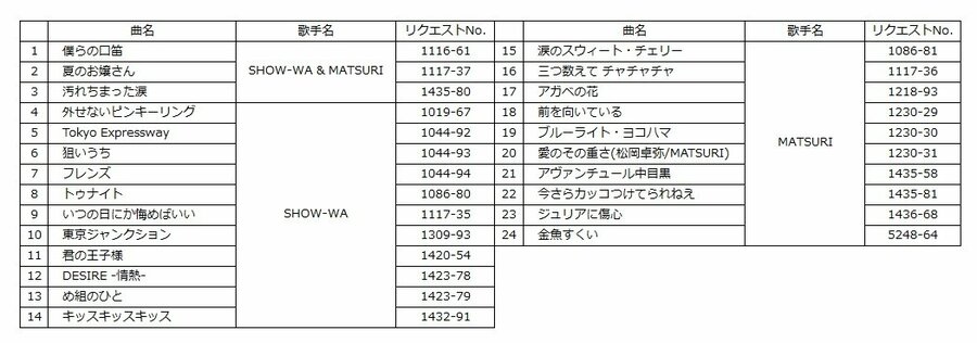 課題曲:SHOW-WA&MATSURI、SHOW-WA、MATSURI DAM収録曲(全24曲)