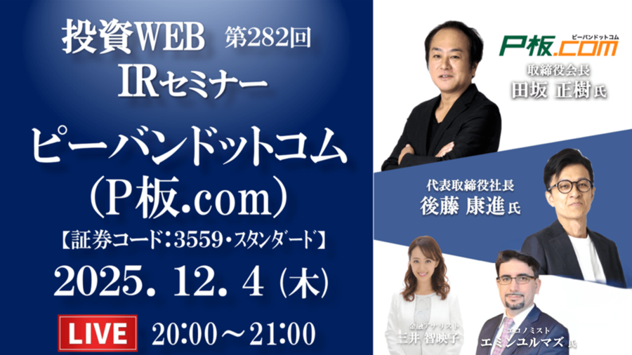 プリント基板のネット通販「P板.com」を運営する株式会社ピーバンドットコム(東証スタンダード・名証メイン 3559、以下当社)は、2025年12月4日(木)に開催される「第282回 投資WEB IRセミナー」(運営:株式会社イベントス)に登壇し、個人投資家の皆さま向けに当社の事業概要および今後の取り組みについてお話しいたします。