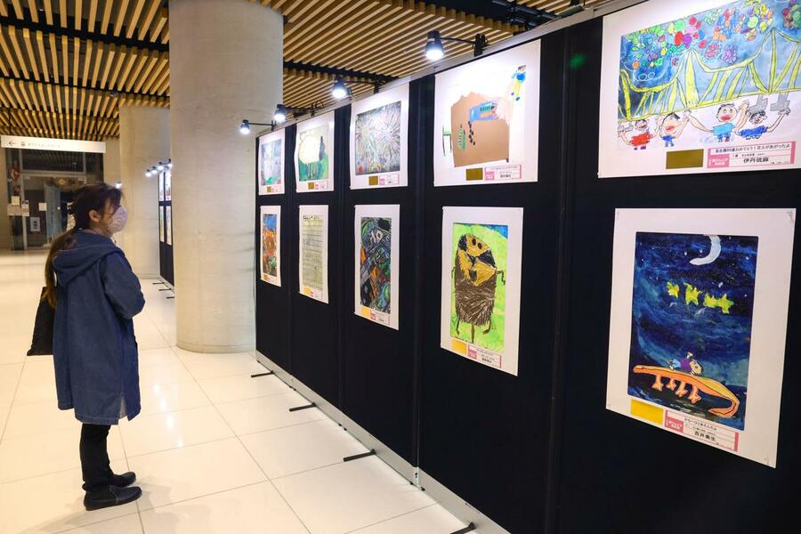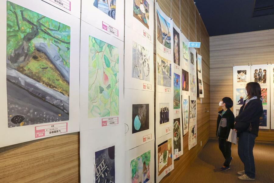 県内の園児、小中学生らから応募のあった1万5896点のうち、入賞作品922点が展示されている。子どもたちが学校での何げない日常や家族との思い出などをのびやかに描いた力作が並んだ。