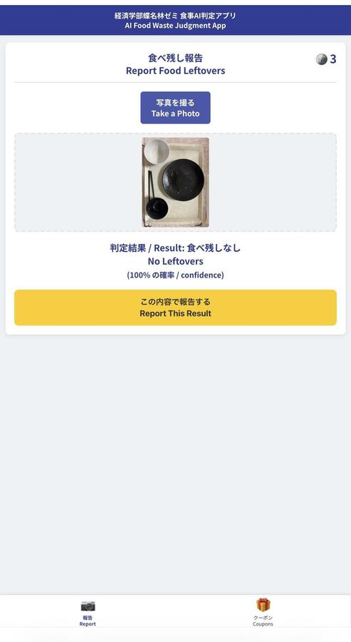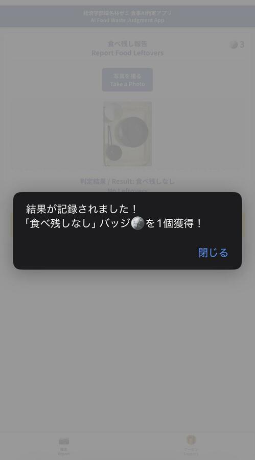 2. AIが食器に残された食べ物を判定し(画像2)、「食べ残しゼロ」と判断されると自動的にポイントを付与(画像3)