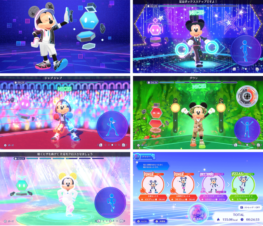 インストラクターとして登場するミッキーは、エクササイズ中にたくさん褒めてくれたり、応援したりといつもプレイヤーに寄り添い毎日の運動をサポートします。衣装やステージ背景も鮮やかな変化でプレイヤーを魅了し、毎日のエクササイズを、もっと楽しく、もっと華やかに彩ります。