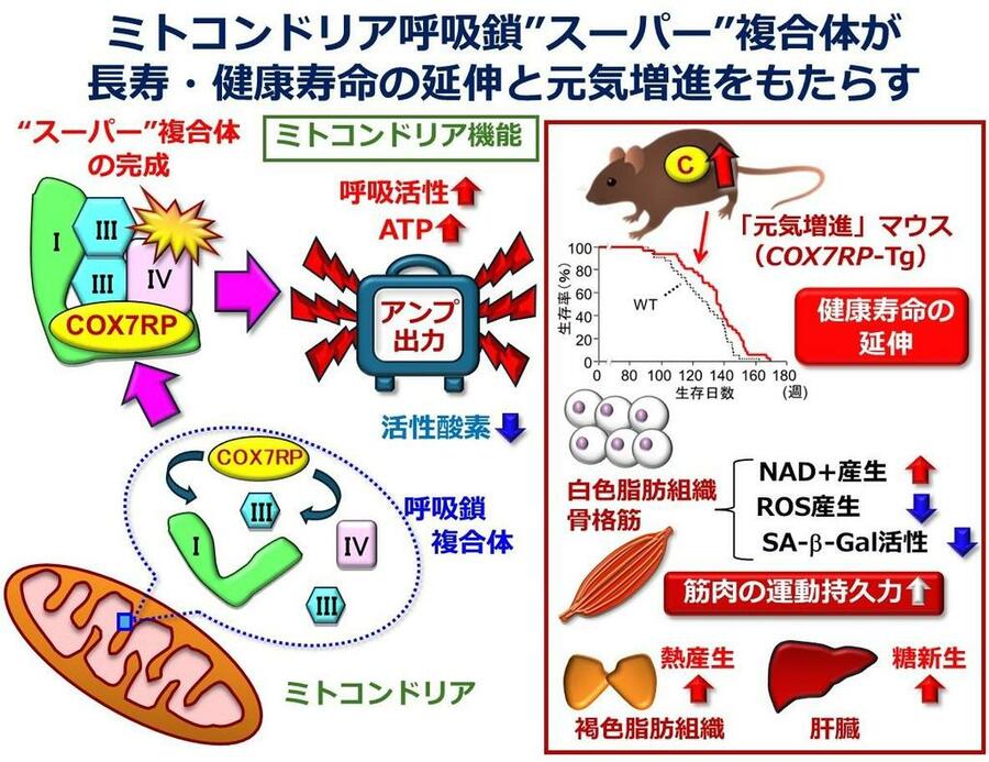 埼玉医科大学医学部 ゲノム応用医学の池田和博准教授、東京都健康長寿医療センター研究所 老化機構研究チーム システム加齢医学の井上聡研究部長らは、千葉大学大学院 医学研究院分子病態解析学講座の協力を得て、日本医療研究開発機構 革新的先端研究開発支援事業(AMED-CREST)ユニットタイプ「元気につながる生命現象の解明と制御」開発研究領域の研究開発課題「心身の元気をもたらす呼吸鎖超複合体動態制御の解明とその応用」の一環として、生涯どの臓器でもCOX7RPがたくさん存在するマウス(COX7RPトランスジェニックマウス)を作り、その寿命や代謝の変化を調べました。