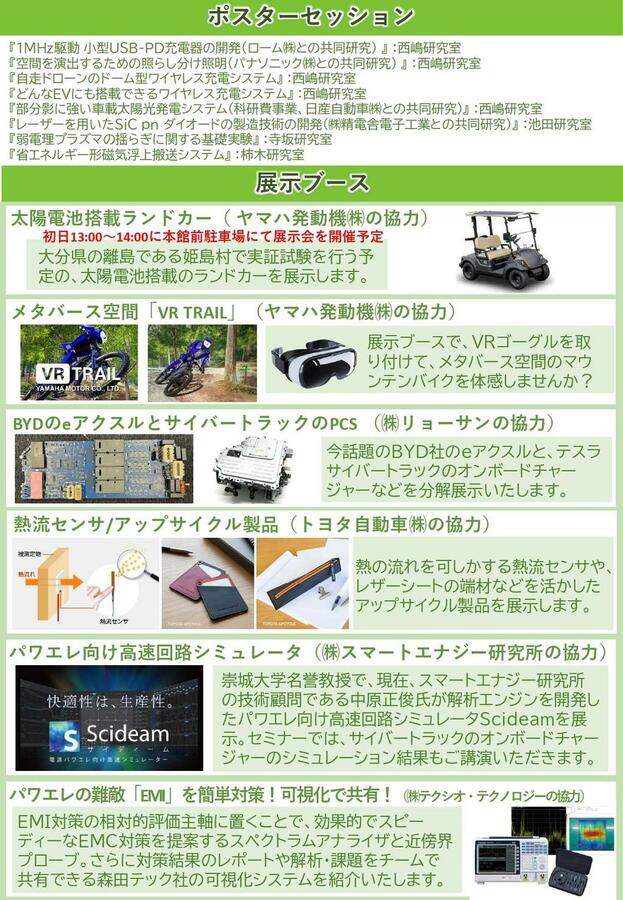 2日目は、電気自動車の充電技術やバッテリーの再利用技術、ロボットなどに関する技術のついての講演や、崇城大学の学生等によるポスターセッションを実施します。