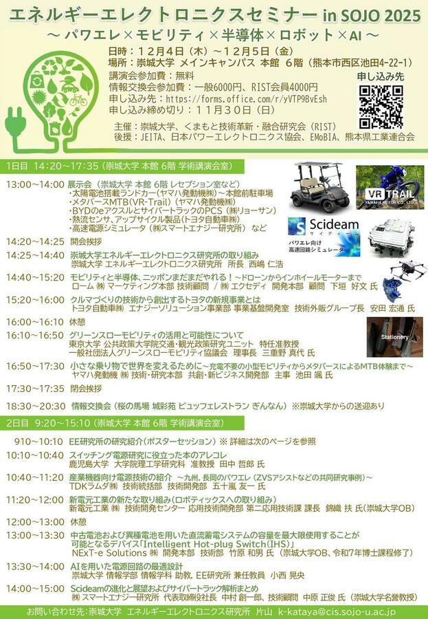 崇城大学では、2025年12月4日(木)・5日(金)の2日間にわたり、「エネルギーエレクトロニクスセミナー in SOJO 2025」を開催します。