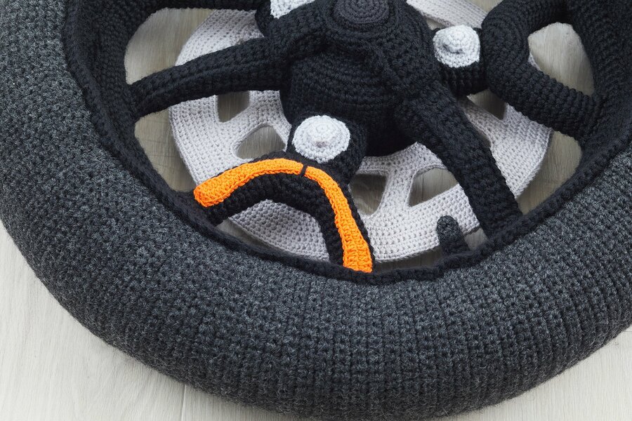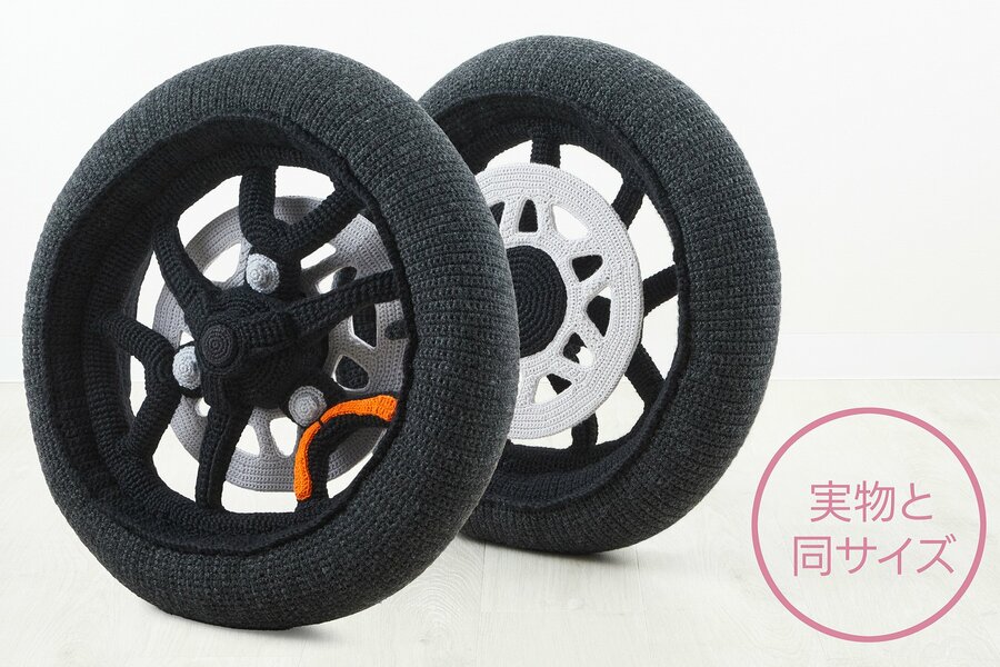 今回お届けする「トリシティ300タイヤ」は、実物大のタイヤ・ホイール・ディスクプレートをあみぐるみで忠実に再現しており、車両に装着することは出来ないもののリビングに置いてクッションやペットのベッドとしての使用が可能です。