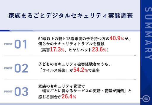 今回の調査結果から、対象者の4割以上(40.9%)が何らかのセキュリティトラブルを経験しており、トラブルの種類として、本人は「不正利用」、親は「架空請求」、子どもは「ウイルス感染」が最多となり、世代ごとに異なるセキュリティリスクに直面している実態が明らかになりました。