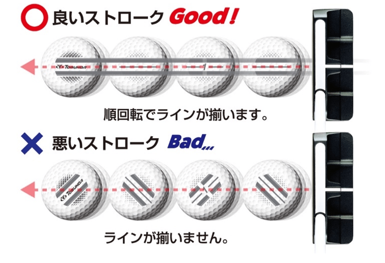 アライメントスタンプが4面に入っていることで、目標に向かって構えやすくなります。また、4面アライメントはパッティング時に綺麗な純回転が生まれると1本のラインに見えることで、ボールの軌道を確認しやすくします。