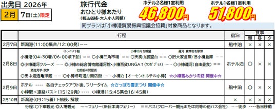 江戸時代中期から明治30年代にかけて、北海道と大阪を主に日本海回りで往来した商船群は北前船と呼ばれ、「動く総合商社」と形容されるほど、その富は莫大なものでした。その歴史を感じる小樽市を北前船研究の第一人者 高野宏康先生がご案内する特別なツアーです。自由時間には、「小樽雪あかりの路」や「さっぽろ雪まつり」をお楽しみください。