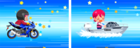 バイク搭乗キャラクターはヘルメット(フルフェイス型で顔は透過して見える仕様)を、ボート搭乗キャラクターはライフジャケットを、着用しています。