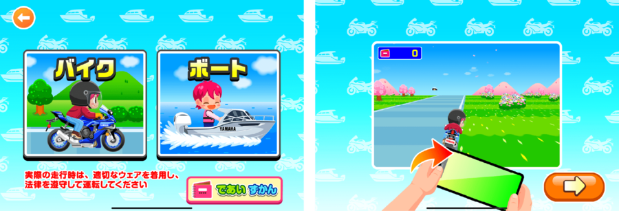 「のって みつけて だいぼうけん!」は、ヤマハ発動機の主要製品であるバイク(陸)とボート(海)の操縦体験をテーマとし、子どもたちが乗り物を通じて、冒険の楽しさや発見の喜びを体験できる直感的な操作が特徴のランゲームです。