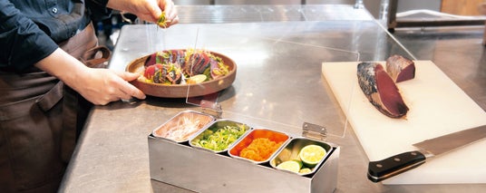 開閉式保冷ヤクミ入れ焼き鳥屋さんからの声で生まれた商品です。保冷剤を入れてヤクミ入れを保冷できるので、狭い厨房で重宝します。冷蔵庫に入れなくても、電源がないところでも、薬味を冷たく保てます!