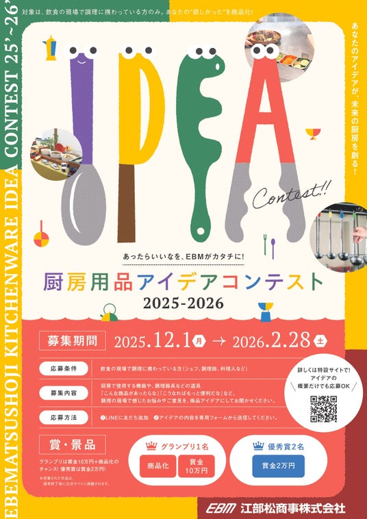 この度、EBM江部松商事株式会社(本社:新潟県燕市、代表取締役社長:江部正浩、以下江部松商事)は、2025年12月より、飲食の現場で調理に携わっている方を対象とした「厨房用品アイデアコンテスト」を初めて開催いたします。
