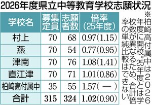 県教育委員会は28日、中高一貫の県立中等教育学校4校と、2026年4月に開校する柏崎高校付属中について、26年度入試の志願状況を発表した。計315人の募集定員に324人が志願し、2校が定員割れとなった。平均倍率は1・02倍だった。