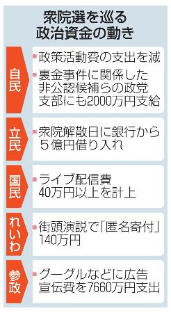 28日公表された2024年分の政治資金収支報告書(中央分)に基づき、3年ぶりの衆院選に臨んだ与野党の資金の動きを追った。派閥裏金事件の逆風を受けた自民党は、衆院解散前に使途公開不要な政策活動費1億円超を党幹部に支出した。国民民主党や参政党は交流サイト(SNS)でアピールするための支出が目立ち、ネット戦略重視の姿勢が鮮明となった。