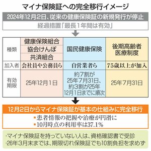 全国民の健康保険証(従来型)が有効期限を迎え、マイナンバーカードに保険証の機能を持たせた「マイナ保険証」を基本とする仕組みに2日から完全移行した。持っていない場合は自治体や健康保険組合などが発行した「資格確認書」で受診する。一方で混乱を避けるための暫定措置として、来年3月末までは期限切れの保険証でも窓口での自己負担を10割ではなく、通常の1〜3割で保険診療を受けられる。