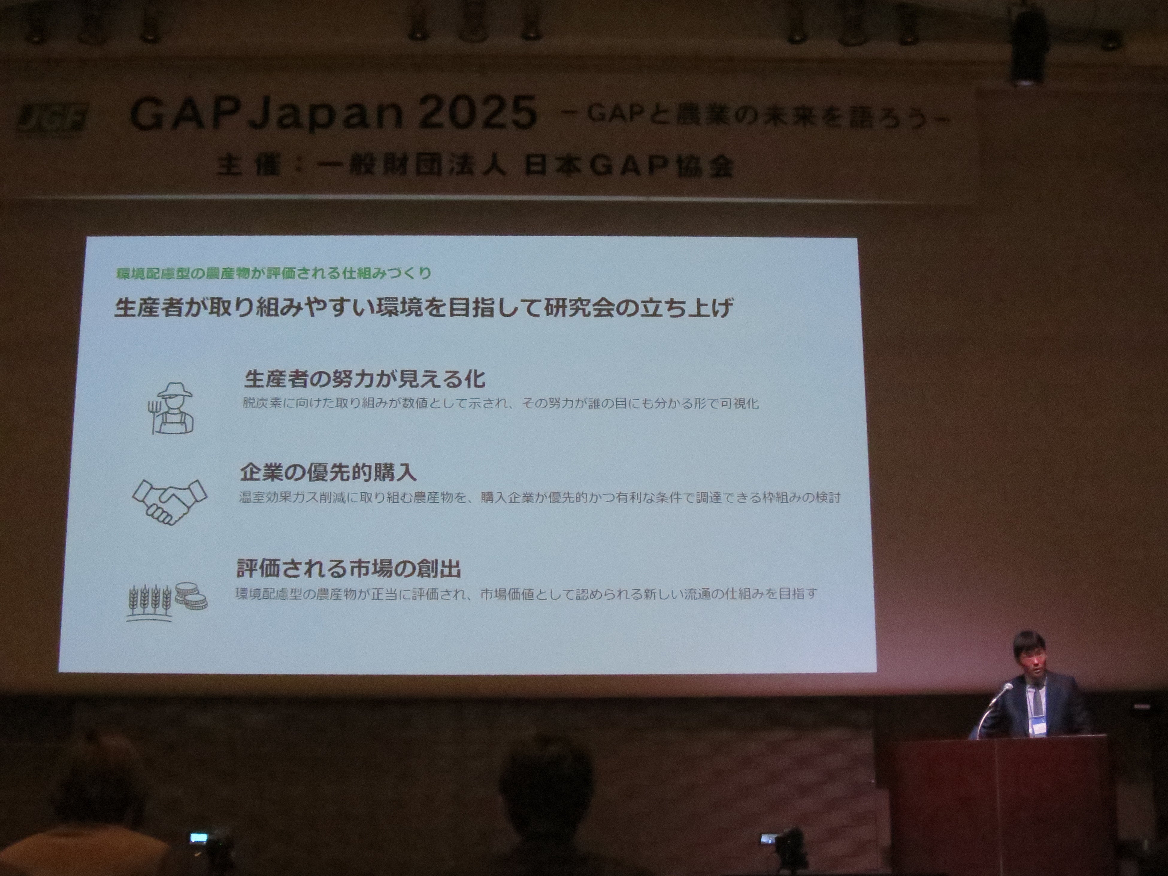 日本GAP協会とサグリ株式会社が開始した「JGAP認証農場の温室効果ガス排出量の可視化に関する共同研究」(2025年10月発表)について、研究の背景と方向性が紹介されました。