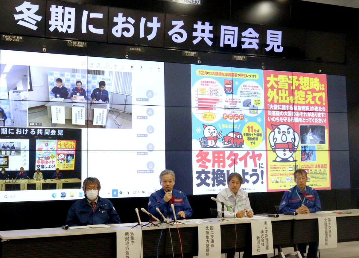 本格的な降雪期を間近に控え、国土交通省北陸地方整備局や新潟地方気象台など5機関は2日、共同記者会見を新潟市中央区で開いた。冬用タイヤの装着を急ぐよう求めたほか、大雪が予想される際には、国道や高速道を通行止めとすることもあるとして、最新の気象・道路情報を確認するよう呼びかけた。