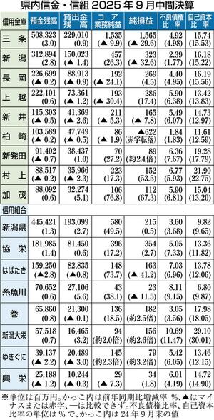 新潟県に本店を置く9信用金庫、8信用組合の2025年9月中間決算が出そろった。本業のもうけを示すコア業務純益は4信金、7信組で前年同期に比べて増加した。日銀の利上げで「金利のある世界」となり、貸出金利息や有価証券利息配当金といった資金運用収益の増加が、預金利息などの資金調達費用の増加を上回るケースが目立った。