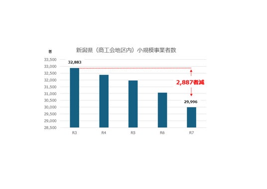 人口減少が続く新潟県において、地域の雇用と活力を支えているのは小規模事業者です。しかし、当会の調査では県内(商工会地区)の小規模事業者は、この5年間で約2,900者も減少しており、このままでは地域の経済基盤が揺るぎかねません。