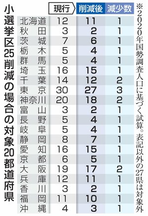 自民党と日本維新の会が今国会に提出を目指す衆院議員定数削減法案を巡り、共同通信社は3日、「小選挙区25、比例代表20」の削減となった場合の定数配分を試算した。小選挙区は20都道府県で1〜3減少、秋田、富山、香川は現行の3から2、沖縄は4から3になる。比例代表も全国11ブロック全てで1〜3減り、四国は6から5になる。2020年国勢調査人口を基にした。自民の非公式な試算と同じ結果となった。実際には25年国勢調査に基づき配分するため変更があり得る。