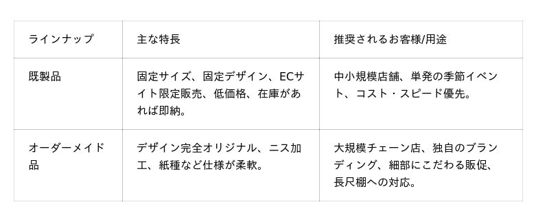 従来のオーダーメイド品は、柔軟なデザイン設計を通じて、店舗のブランディングや、売場ごとの統一感演出をサポートしてまいりました。一方既製品では、規格化による低価格と導入の手軽さを提供し、この度の季節デザインの追加により、短期的なイベント販促における即戦力としてお客様の売場づくりに貢献します。