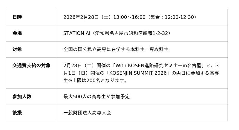 この度の「With KOSEN進路研究セミナーin名古屋」は、これまで培ってきた高専生の就活支援に関するノウハウとネットワークを活かし、学生・企業双方にとって価値ある出会いを生み出すイベントとして企画いたしました。本イベントは翌日に行われる「KOSENJIN SUMMIT 2026」の前夜祭企画で、両日参加する高専生は当社が交通費を全額支給いたします。