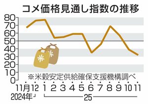 向こう3カ月のコメ価格の見通しについて、米穀安定供給確保支援機構は4日、11月の指数が前月より7ポイント低い32になったと発表した。2カ月連続で節目の50を下回り、値下がりするとの予想が強まった。新型コロナウイルス禍で需要が落ち、27を記録した2021年9月以降では最も低い水準。