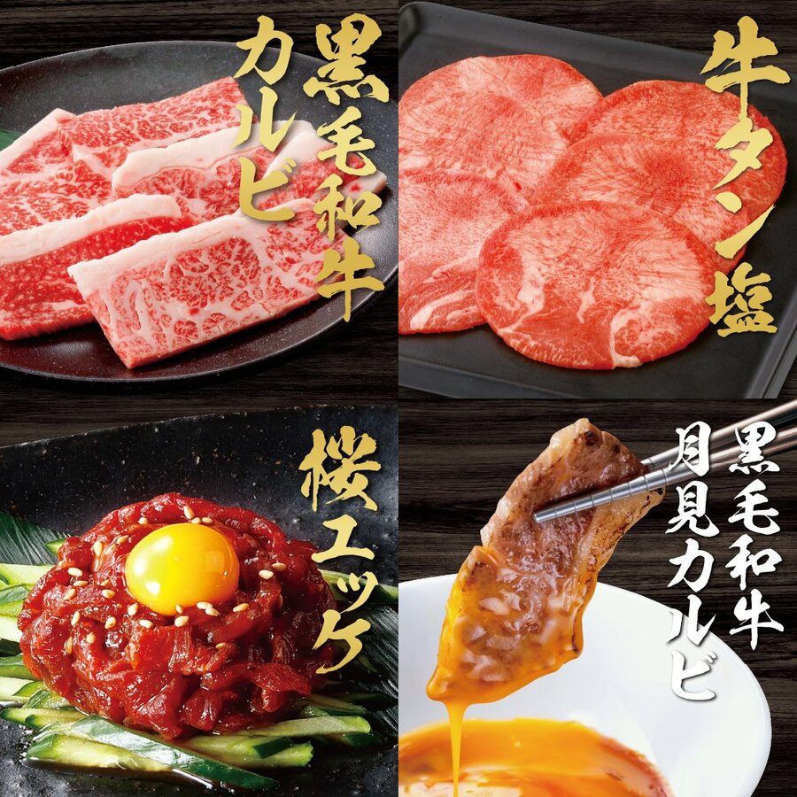 網目状のきれいなサシが入った、黒毛和牛ならではの旨み。肉質が柔らかく脂の甘さを感じられる「黒毛和牛カルビ」、贅沢にとろける旨さを堪能できる「黒毛和牛月見カルビ」の他、「桜ユッケ」も食べ放題の特別なコースです。