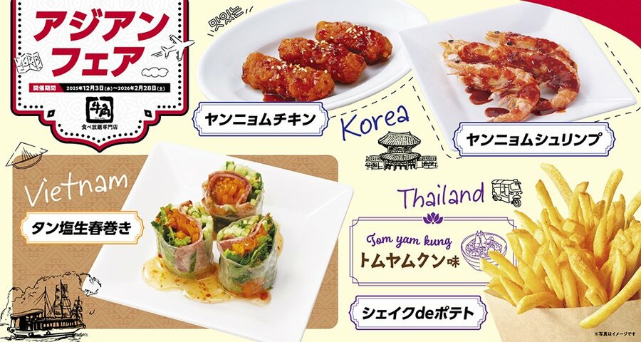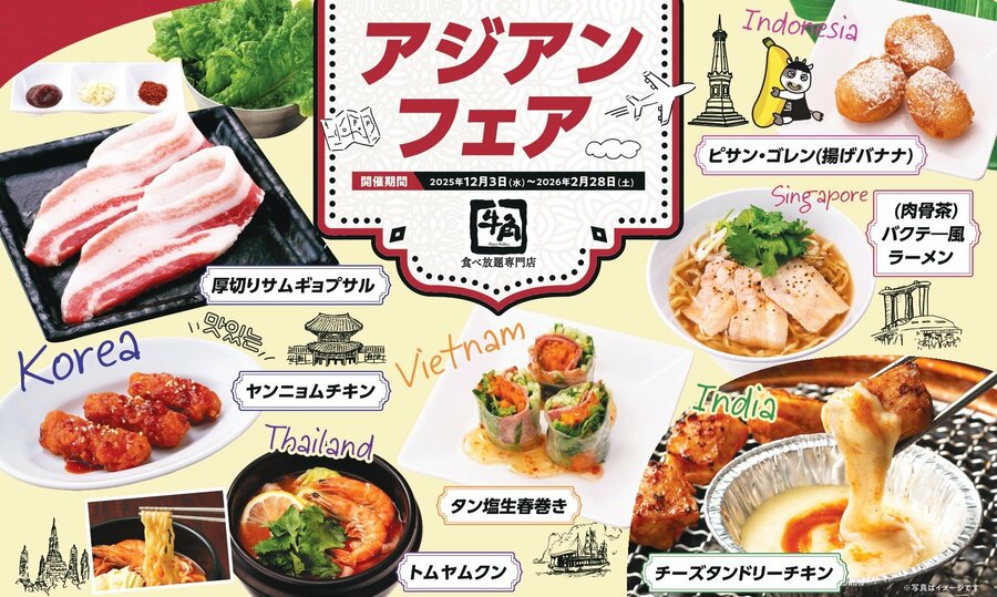 コロワイドグループの株式会社レインズインターナショナルが展開する「牛角食べ放題専門店」では、2025年12月3日(水)~2026年2月28日(土)の期間限定で、全6カ国の名物グルメを楽しめる「アジアンフェア」を開催しています。定番の食べ放題メニューに加え、韓国・タイ・シンガポールなどの名物メニューが登場し、1回の食事で“海外旅行気分”を味わえる体験型企画です。
