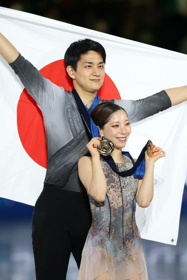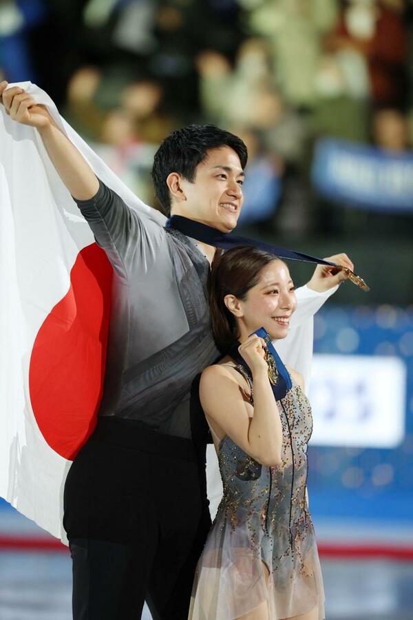 ペアで優勝した三浦璃来、木原龍一組が表彰式で金メダルを掲げる=IGアリーナ