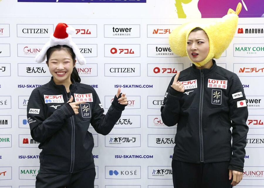 記者会見後、かぶり物を頭につけて撮影に応じる中井亜美(左)と坂本花織=IGアリーナ