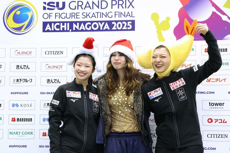 記者会見後、かぶり物を頭につけて撮影に応じる中井亜美(左)とアリサ・リュウ(中央)、坂本花織(右)=IGアリーナ