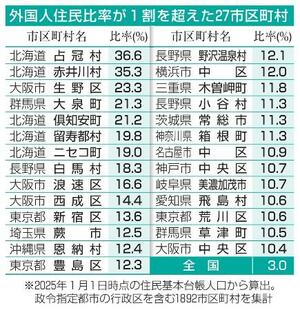 日本に住む外国人が急増している。国の研究機関の推計では、2070年に外国人が総人口の10・8%を占めるようになる見通しだ。こうした中、住民基本台帳のデータから全国の自治体の外国人住民比率を計算したところ、27市区町村では今年1月時点で既に10%を超えていたことが分かった。比率トップは北海道占冠村の36・6%だ。