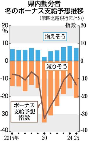 第四北越銀行(新潟市中央区)が発表した2025年冬の消費動向調査によると、今冬のボーナスが前年より「増えそう」と回答した割合から「減りそう」とした割合を差し引いた支給予想指数はマイナス13・5で、24年冬と比べ6・5ポイント低下した。低下は冬のボーナスとしては5年ぶり。使途は「預貯金等」の割合が半数以上で最も高かった。