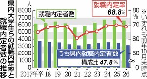 新潟労働局は5日、2026年春に卒業を予定する県内の大学生、短大生らの就職内定率が10月末時点で68・8%だったと発表した。過去最高となった前年同期に比べ微減となったが、企業は人手不足などを背景に採用を強化しており、就職内定率は依然として高水準で推移している。一方で、県内企業の内定を得た人の割合は5割を下回り、平成以降で最低。県外への流出が進んだ。