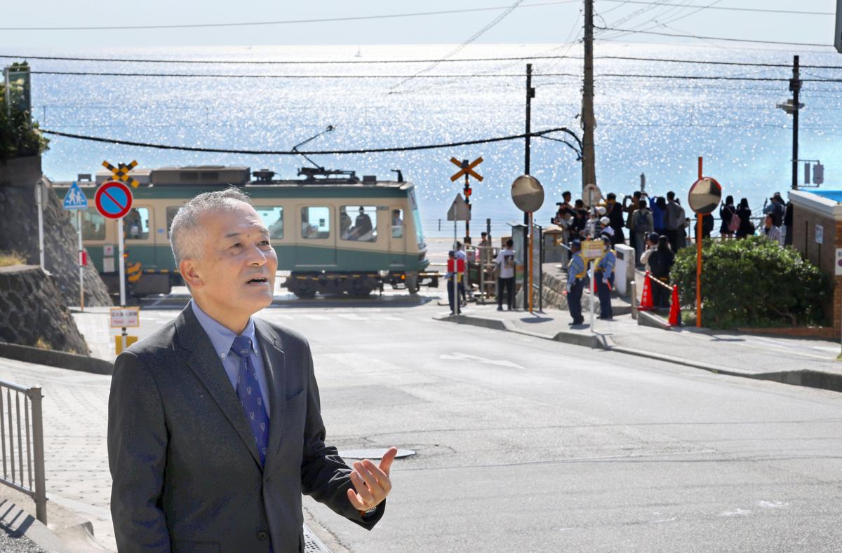 広い空ときらめく海を背景に、レトロな電車が住宅地を進む。神奈川県鎌倉市にある江ノ島電鉄・鎌倉高校前1号踏切。バスケットボールに打ち込む高校生を描いた1990年代放送の人気アニメーション「スラムダンク」のオープニングに、この場所と似たシーンが登場することから、ファンの間で長らく「聖地」とされてきた。ここで今、オーバーツーリズム(観光公害)が巻き起こっている。