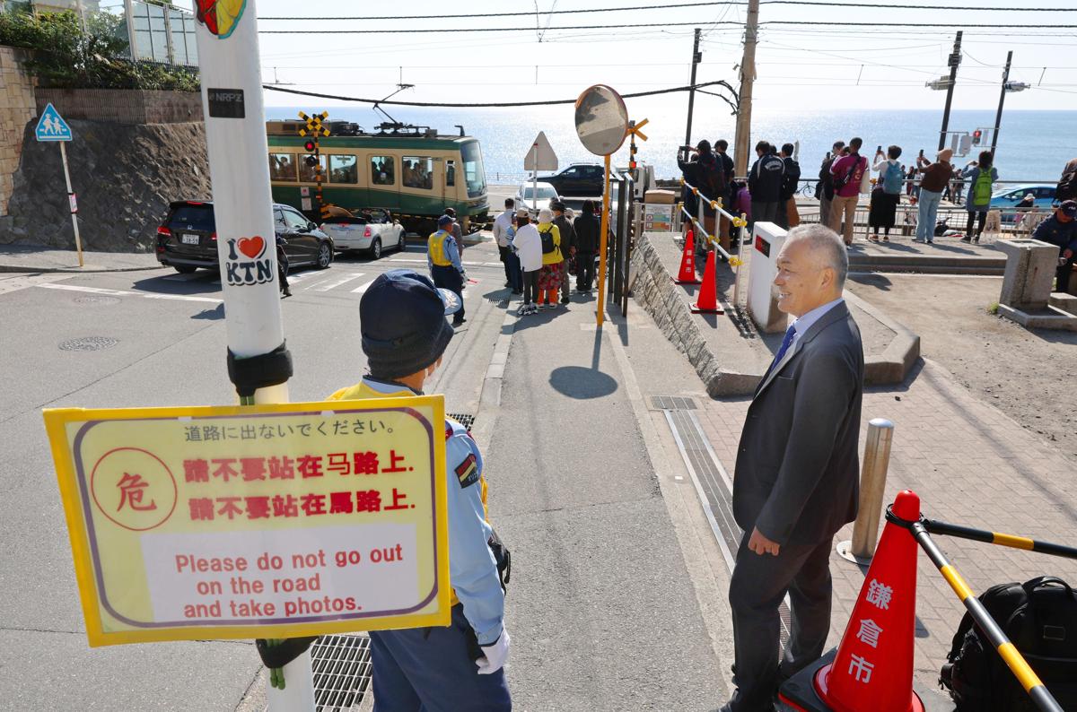 よく晴れた秋の平日、踏切周辺は200人近い人で混雑していた。休日などに警備のボランティアを行う団体「鎌倉ガーディアンズ」代表の大津定博(62)=鎌倉市=は「まだ少ない方。連休になると、常に500人近くいる」と苦笑いする。