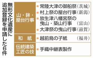 国連教育科学文化機関(ユネスコ)の無形文化遺産登録を審査する政府間委員会が8日、インドの首都ニューデリーで開幕した。既に無形文化遺産となっている「山・鉾(ほこ)・屋台行事」に茨城、新潟、富山、滋賀の4県の祭りを加えるなど、日本政府が追加申請した6件が審査される。事前審査で登録勧告を受けており、勧告通り登録が正式決定する見通しだ。