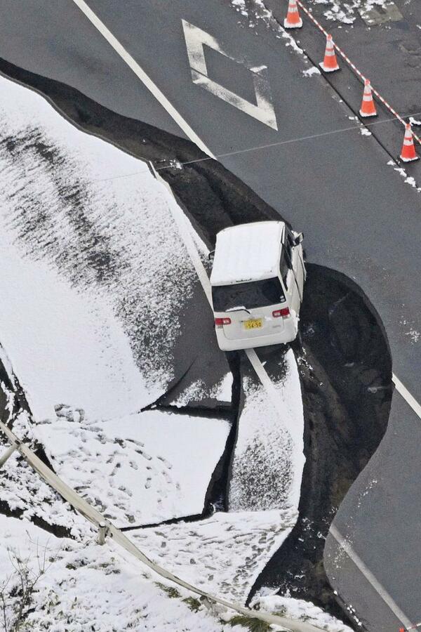 強い地震があった青森県東北町の陥没した道路と車両=9日午後0時5分