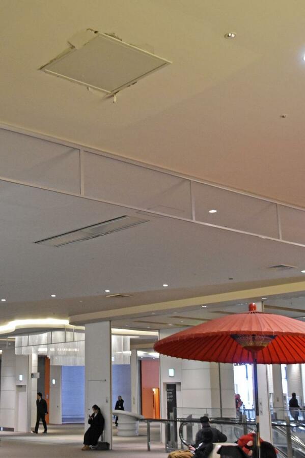 北海道千歳市の新千歳空港国内線ターミナルビル4階の天井にできたひび=9日午前