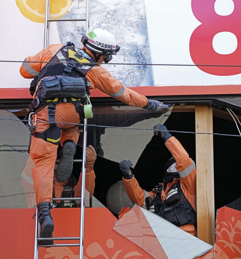 強い地震があった青森県八戸市の飲食店で割れたガラスを撤去する消防隊員=9日午後0時55分