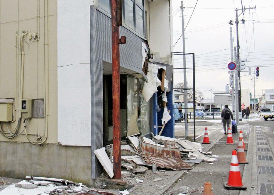 強い地震があった青森県八戸市で外壁が損壊した建物=9日午後0時18分