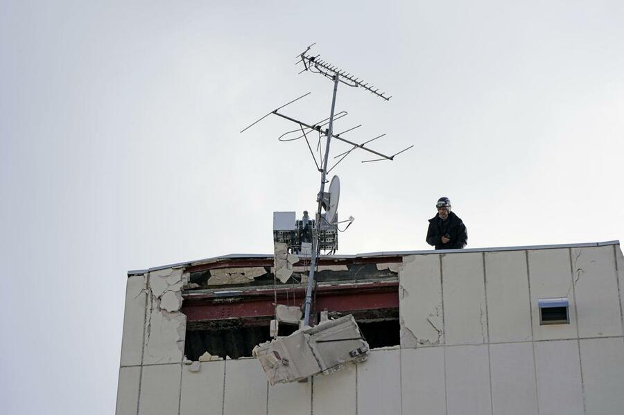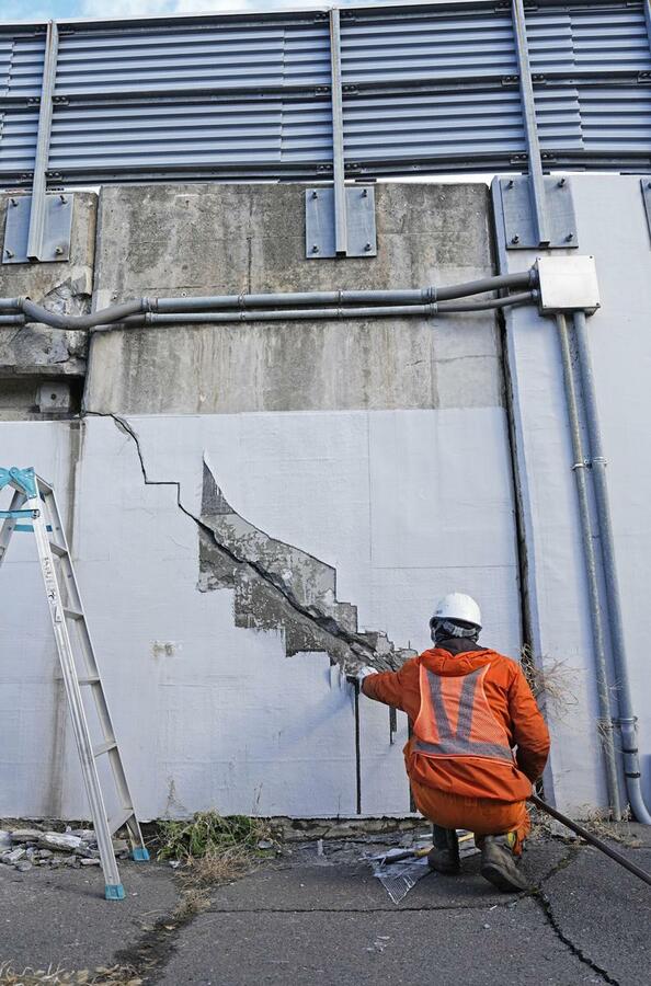 強い地震があった青森県八戸市で道路を点検する作業員=9日午前11時5分