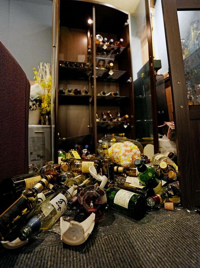 強い地震があった青森県八戸市のスナックで散乱した酒瓶。女性店主は「(瓶が)とび出さないように対策はしていたのに…」とため息をついた=9日午後0時12分